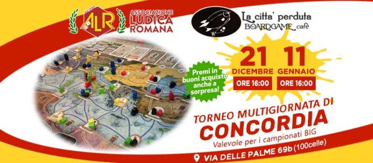 L’Associazione Ludica Romana organizza un Torneo BIG di “Concordia” presso il Board Game Cafè “La Città Perduta” (via delle Palme 68b, Roma) Il torneo è valido per le qualificazioni BIG (Board Italian Gamers ). Preiscrizioni qui 👉 /#tornei Il Torneo si svolgerà nelle giornate di domenica 21 dicembre…