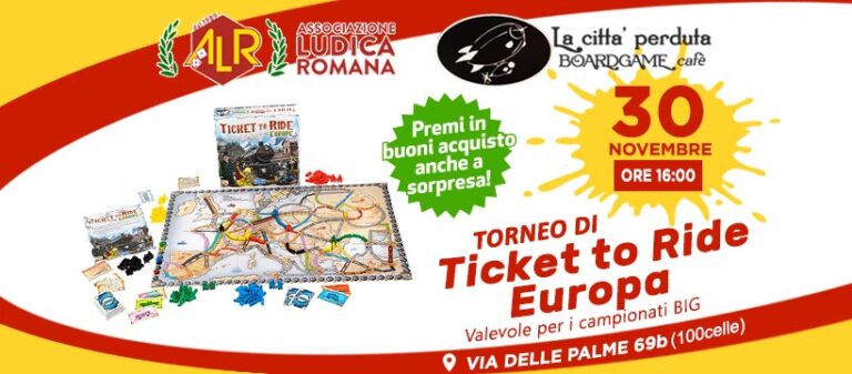 Torneo BIG di “Ticket to Ride – Europa” presso il Board Game Cafè “La Città Perduta” (via delle Palme 68b, Roma) Il torneo è valido per le qualificazioni BIG (Board Italian Gamers ). Preiscrizioni qui 👉 /#tornei Il Torneo si svolgerà sulla lunghezza di due partite secondo le…
